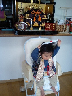 去年は、初節句という事で、私の両親に、兜を買ってもらいました。北大阪に住んでる私たちは、去年は、わざわざ南大阪の旦那様の実家へ兜を運び、旦那様の実家で、私の両親も招いて初節句のお祝いをしたのでした。今年は、何処に飾ろう。今年は実家じゃなく、うちの家に飾ります。和室に飾るのが一番なんだけど、当然みずが、触る。仕方ないので、カウンターに、飾ったよ。昨日みずが寝てから。旦那様と。今年のGWも実家に里帰りするので(両家の実家が近い)こどもの日当日は、家にいないので、早速記念撮影~義兄にもらった服を着せ、テーブルをのけて、ハイローチェアに座らせ鉢巻をして撮影しようとしたけど、当然嫌がりますスタジオアリス風?笑去年は、スタジオアリスで、桃太郎の衣装着て撮影したよ~。何枚か撮影したけど、今日はこのへんにしといたろ。土曜日は、雨だったけど、今日はいい天気なので、すぐそばの公園に遊びに行きました。お気に入りの「お砂場セットのバケツ」を持ったまま、お得意の滑り台写真撮影のときより、当然生き生きしてました!笑もうすぐ私の3△歳の誕生日!昨日は、サンマルクのランチに連れてってもらいました。みずは、食べ放題のパンをたぶん5~6個は食べてたぞ。美味しかった~。来週は、焼肉も連れてってもらいます!別に欲しい物ないし、どうせ会計一緒だし一緒に美味しいもの食べます!明日からまた仕事でも、来週の焼肉を楽しみに頑張ります!