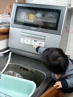 今日、雨の中、家族3人歩いて「ミド○電化」へ。買っちゃいましたヾ(〃^∇^)ノ食洗機~初め予定してたのは、サン○ーから出てる、工事不要タイプだったんだけど、あらためて見ると、ちょっと小さめ。5人用って書いてるけど、他のメーカーは、6~7人用。出来たら、これから、朝食・夕食分をまとめて、ガーっと洗いたい所。昼は、平日はなくなるからね。置けるなら、たくさん洗える方がいいよね。工事も、賃貸だから、穴を開けるとか、現状に戻せない工事はNGだけど水道の所に、部品を入れるだけの簡単な工事との事で結局ナショナ○製の、工事必要なタイプにしました。予算より1万円くらい、工事の部品代の分高くなってしまったけど後から、やっぱりたくさん入るやつにしたら良かった・・・と後悔したら大変だからね工事費用はミド○もち。部品代だけ余分にかかりました。新しもん好きなみずうれしそうに眺めてます。早速、昼から工事に来てもらって、朝の分と昼の分を入れてみました。このために、朝の洗い物サボってためてたしピッ・ピッ・ピッ。サ~~♪う~ん優雅~軽やかな音を聞きながらコーヒーなんて飲んじゃいました♪カレーのお皿なんかも、そのまま入れていいみたい。でも、気になるから、バット?にお湯を溜めて、簡単に汚れを落としてから入れようと思います。だって、洗い終えた後まな板に、お昼の鶏肉が少し残ってました。でもそれ以外は大満足だけど、今月の我が家の家計は大赤字育児&家事&仕事の3両立。忙しい忙しいともんくを言わず頑張って稼ぐとするかっ