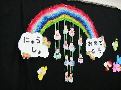 今日は、保育所の入所式でした入所式といっても、堅苦しいものはなく、新入と進級をお祝いする会って感じで、服も、普段着でOK。朝10時に、保育所に行くと、すでに「みず用」の下駄箱も用意されていました。名前付きの写真も「たんぽぽくみ」に飾ってくれていました。保護者も、さすが?保育所だけあって、みんなお仕事されてて来てるのは、新入生の保護者だけだったように思います。10人ちょいかな?あ、そうそう。今年は0歳クラスは、1人しかいないんだって。みずの1歳クラスは、12人。去年もそうなら、うちも待機せずにすんだのにな~。まあ、結果的に、4月で満足してるけど。年によってずいぶん違うのね~ホールでの入所式。保育所らしい手作りの飾りつけ。かわいいな~0歳クラスと、1歳クラスは、カーペットの上に自分で座るか先生もしくは、ママ抱っこ。お兄ちゃん、お姉ちゃん達は、音楽に合わせてホールに入ってきますそして、きちんとイスに座ります。所長さんのお話があり、その後、みんなで、ちゅうりっぷなどの歌を歌ったり、手遊び、パネルシアターなどをしてくれました。そして、順番に担任の先生の紹介の後、一人一人、名前を呼んでくれます。60人ちょっとの小さい保育所。お兄ちゃん、お姉ちゃんはもちろんみずと同じクラスの友達も元気に「はーい!」としてる子もいました。みずは、座ってママ抱っこだったんだけど、途中で動けないので愚図ってしまって、仕方ないので、立って後ろのほうで参加しましたうーん。明日から大丈夫かしらその後は、お昼ご飯0歳&1歳クラスは、部屋には柵をしていて、保護者は普通入れないんだけど、今日は特別との事で、食事するのを見てきました。メニューは、豆ご飯・肉じゃが・具だくさんのコンソメスープでした。うちより美味しそう食べ物に関して貪欲なみずは、さっきの愚図りは何処に?という感じでスプーンと手づかみを駆使して?パクパク!完食しましたエプロンは、いろいろ買ったのもあるけど、今日のは、ハンドタオルにパンツのゴムをつけただけ。たくさん作ったよ。最後のお茶まで「ちゅー」と飲んで、最後には、ごちそう様!と手を合わしてました。さて、明日から6時過ぎに起きて、7時半~17時半まで保育所に預けて、21時に寝かして、私も11時半に寝る!ってのが目標残業が多かったとき、日曜日にまとめてご飯を作って冷凍とかしてたけどこれからも、そうしようと思います。とりあえず慣れるまでは。昨日は、カレーと、おでん(昨日の夕食)を炊いたので、あと何か作って、今週乗り切ろうとするか。家に帰ったら、まず洗濯回して、ご飯を炊いて・・・なるべくおかずはチン!か焼くだけ。すっごい忙しくなるけど、昨日の食洗機にもフル稼働してもらって頑張ります!いざ出陣~応援してね~ヽ(´Д`;ヽ≡/;´Д`)/