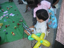 先週の木曜日から出ているみずの蕁麻疹保育所では、金曜日も少し出てたみたいだけど、家では全く出ないので私には分かりませんでした。でも、今日、でっかい蚊がみずの顔さしたんだなぁ・・・なんて思ってたんだけど、ん?ダニ?虫刺され???って思ってました。今日、みずの散髪に行って(4月23日の日記(画像付き)の時とは違って、午前中行くと、お腹がすいて激泣きで帰る。午後から行っても、やっぱり愚図ってしまって、今日はママが抱っこしながら立ったままの散髪でした。でも700円にしてもらっちゃいました。4月23日はおとなしくてびっくりしたのに。)帰ってきてから、細かい髪の毛がついていたのでシャワーしようと裸にすると背中にもたくさん蕁麻疹って、突発性発疹の時のようなブツブツかと思ってたけど、蚊にさされたみたいに、プクッと膨らんだような状態なのね・・・本人痒いとかはなさそうだし、また月曜日にでも病院行ってみよう。食べ物で蕁麻疹が出たんではなくて、体調とか、ストレスで出るものなのかな?今日は、保育所の夕涼み会家族3人で自転車で行きました。もちろん甚平着せて行くと、おなじタンポポ組のお友達とパパ&ママも来ていて、私もいろいろ話す事が出来ました普段は時間帯が全然違うから、会えないんだけど、こういう機会があるとうれしいなぁ。園庭でスーパーボールすくい・ヨーヨーつり・プラバン・てづくりオモチャ輪投げ・バルーンアート・カンバッチをやっていて、もちろん無料。カードに終わったものはスタンプを押してもらいます。手作りオモチャで紙でつくった目がねにマジックで色を塗ってるみず。自分の手や顔・甚平までマジックで塗ってましたでもとっても楽しくて、なかなか離れてくれませんでした。輪投げでは、3回とも失敗したけど、オモチャもらいましたこのオモチャは、保育所の保護者から、いらないオモチャを集めたものです!無料でこんなにいろいろもらったよ。シャボン玉や、カンバッチ(画像に載ってないけど)も作ってもらいました。園庭での盆踊り?!(保育所オリジナルっぽい)が終わって、最後に保育所の室内のホールでジャグリングもしてくれました。以前、園庭開放に行った時に来ていたお兄さんかな~。初めは、じーーーっとみてたみずですが、途中から、私がもっていたホームビデオに興味深々保育所のイベントに始めて参加したけど、楽しかった~