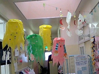 金曜日一週間のうちで、一番ほっとする瞬間壊れそうな月末とは違い、月初はまあまあ落ち着いていました。といっても時間中は必死でも、まあまあ早く帰れました^^4月に復帰して3ヶ月たちました。やっと仕事も大分覚えてペアの子の足を引っ張ってた私も、やっと役立つようになってきたかもちょっと私も仕事の要領も悪かったと思うし、どんくさく時間がかかっていた処理だけど、早め早めに準備し、また月末乗り切ろうと思います。旦那様も、もし月末最後の週で早く帰れる日があれば、みずを迎えにいってくれるという事だったので、ストレス溜めないように頑張ろうと思います。月末以外は、早く帰るからねぇ~昨日、会社を出ようとしたときに、保育所から電話が。「みずくん、3時のおやつの時に、寒天と、缶詰のみかんと桃と、メロン(本物)を食べたんだけど、蕁麻疹が出てね。熱もないし機嫌もいいし、今はなんともないけど、一応お伝えしておきますね」迎えに行くと、すっかり消えていました。体調が悪い時、大人でもメロンや柿で蕁麻疹出る時あるよね。病院行ったほうがいいのかなぁ。蕁麻疹なんて初めてだしびっくりしました。ちょっと様子みようと思います。保育所で七夕の飾りを作ったみたい。上はみずが作ったもの。緑色のナイロンの袋にシールぺたぺた貼ったり、手形を押した紙を貼ったり。下はもう少しお兄ちゃんお姉ちゃん。保育所で短冊をもらったので願い事を書いたので、笹にもつるしてもらいました。保育所で作った作品ってホントかわいいよね明日は、夕涼み会。楽しみだなぁそうそう。同じ会社の先輩ママ。みずの一つ上の男の子がいるんだけど来週会社休みます。夫婦でベトナム&カンボジアに行くみたいいいなぁ。でもね、子供は実家のお父さんと妹に預けて夫婦だけで行くんだって。うらやましいけど、私なら、連れて行く事考えるかなぁ・・・。しかも5日ほど留守するし。妹さんにはすごくなついてるみたいだけどね。子連れで旅行は大変だけど、こないだのディズニーは一緒に行ってホントに楽しかったし、やっぱり子供と一緒に楽しめる旅行をしたいなぁ。いろんなスタイルがあるんだなぁって思った日でした。