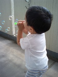 3連休ですね~仕事をしていると、休みってほんっとにうれしい。旦那様は月曜日は仕事だけど、私は3連休。充電するよ~先週の木曜日から出ていた蕁麻疹。結局月曜日の夕方やっと病院へ蕁麻疹で、食べ物が原因の場合はまれで、おそらく疲れとか、その日の体調などによるものとの事でした。飲み薬と塗り薬をもらって、二日ほど飲ませたら、すっかり完治しました。たいした事なくて良かった。でもなんだったんだろう。ストレスかなぁ。というわけで、やっと保育所でプールデビューといっても、0歳・1歳クラスは、一人用の「ベビーバス」や「たらい」で入れてくれるみたい。O157の関係上らしい。ベビーバスに、スーパーボールとか、じょーろとか、入れてもらっておおはしゃぎだったそうです蕁麻疹心配してくださってありがとうございました!家で、「お父さん」「お母さん」と呼ばせるようにしています。自分たちがそういう風にそだっていて、「パパ」「ママ」が気恥ずかしいのででも、保育所では、言いやすいし、みんなまわりは「ママ!」「ママ!」という訳で、お迎えに行くと「ママ~!」って走ってきます。でも、旦那様の事は「とーちゃん!」なのです(笑)ぐーぴたっさんとこの、いっくんみたいに「とーちゃんの!」「ママの!」って言うようになってきました。二語分はまだだけど、ますます可愛いね。←親バカ。そうそう。トイレトレの状況ですが・・・保育所では、周りがみんなオマルでおしっこするので影響されて日中、布パンツなのですが、ちゃんとオマルでおしっこをするので濡れた布パンツがめちゃめちゃ減りました。こないだなんて、たった一枚。家では、ちゃんとオマルでするときもあれば、しないときも。そしてウンチは成功した事がありません。いまだ!と思ってオマルに行っても、ウンチがひっこんでしまいます(涙)あとは、膀胱に溜めることが出来るようになってきたみたいだけどまだ行きたい事を教えてくれないので、定期的に座らせる形です。ガンバレ~みず~夕涼み会でもらった、しゃぼん玉。飲んでしまうかな?って思ったけど意外にも上手でびっくりしました。