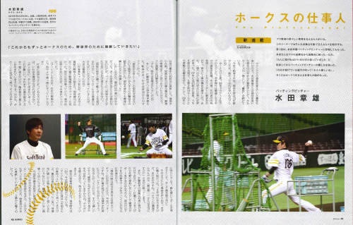 ホークスは今日も勝って、日本ハムと並んで4位タイになりました。厳しい闘いが続くと思いますが、これからの追い上げに期待です。さて、1ヶ月以上前の話になりますが、「月刊ホークス」の2013年6月号に水田さんの記事が掲載されたとの情報を福岡在住のホークスファンの方からいただき、すぐに購入。ありました~。引退した後も、こういった形で記事になるとうれしいですね~。ちなみに、「ホークスの仕事人」は、月刊ホークスの特集記事の一つで、6月号から新たに始まった企画。そのトップバッターに水田さんが選ばれました。しかも、ページ数が44ページというところがにくい演出ですね。※現役時代の水田さんの背番号は44番。月刊ホークス編集部の皆様、ありがとうございました!ぜひ続編もお願いします。新たな企画として「あの選手は今」みたいな感じで、5年後、10年後の選手の近況を報告するような企画(選手の第二の人生を応援するような企画)があってもいいのになと思いました。
