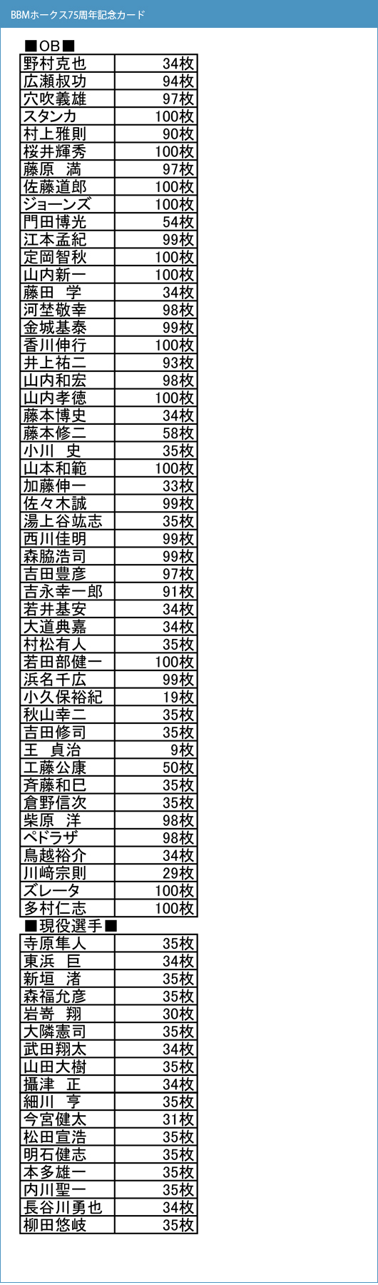 水田さんの直筆が封入されるラストチャンスかも・・・・と、淡い期待を持ちつつ、BBMのリスト発表を待っていたホークス75周年カードセット。BBMのWEBサイトでリストが発表されました。今回も残念ながら、水田さんの直筆封入は見送られました。直筆の種類数がちょっと多かったので、2年前の「惜別」セットの時よりも可能性があるかなーと思っていたのですが、やっぱりというか、何とも残念な結果に。リストの面々を見ると、水田さんが選ばれるには、現役時代にもう一踏ん張り必要だったのかなー(笑)次回のホークス周年ものは、たぶん80周年?になるかと思うのですが、カード化の対象になる選手は今後もどんどん増えるでしょうから、ますます可能性は低くなっちゃいますね。うーん。テンション、かなり下がりました(笑)