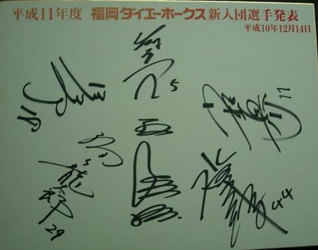 実は、50000ヒット達成の陰に隠れて、1月11日にブログ開設2周年を迎えていました。→昨日、そのことに気がつきました・・・・(笑)。2年前にブログを始めた時には、とりあえず3か月続けられればいいや・・・・的なノリで始めましたが、どうにかこうにか2年持ちこたえました。今までに少なくとも10回以上は挑戦した日記でさえ、長くて1週間くらいで挫折したのに(いわゆる、三日坊主というやつです)、正直ここまで続くとは自分自身が一番驚いています。昨年の水田さんの現役引退以来、カードの収集やホークスの応援に関して、ちょっと張り合いをなくしちゃったかなという部分もありますが、もうちょっとだけ頑張ってみようかな~と思っています。そういえば、ホークスは2月1日から宮崎キャンプですね。水田さんも、投手陣を支える裏方として参加します。時間とお金に余裕があれば宮崎に行きたいのですが、今年もちょっと無理そうです・・・・(涙)宮崎方面の方で、水田さんのキャンプ中の動向など、情報をご存知の方がいらしたら、ぜひぜひご一報を~昨日、部屋を少し整理した時に棚の隙間に挟んでいた額から、こんなものを発見しました。98年オフのドラフトでホークスに入団した選手の寄せ書きサインです。王さんのほかに、吉本亮選手、松修康さん、小椋真介投手、福山龍太郎さん、そして水田さんのサインが入っています。この色紙は、入団会見の時に関係者に配布されたもののようです。この中で、まだ現役で頑張っているのが、吉本選手(ヤクルト)と小椋投手。2人にはまだまだ頑張ってほしいですね。