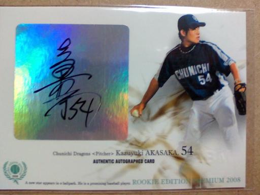 昨日ご紹介した大竹投手のカード交換が成立した翌日に交換が成立し、到着したのがこちらの1枚。08ルーキーエディションの赤坂選手の直筆です(画像は以前ご紹介したものを転用しました・・・・笑)。以前、所持していましたが、トレードで手放して、1年半ぶりに再び手元に戻ってきた1枚です。07年オフのドラフトで高校生1位でドラゴンズに入団。昨シーズンのオフに自由契約になり、今シーズンからは外野手に転向して、育成選手として再起を図ることになりました。浦和学院高校時代は、野手としてのセンスも評価されていました。こんどは投手を支える側にまわって、心機一転。新たな活躍の場が見つかることを願っています。昨日ご紹介した大竹投手は、浦和学院高校の先輩にあたります。初めてBBMのチームリミテッドから自引きした直筆が巨人の須永投手(浦和学院出身)ということもあり、浦和学院出身の選手にはついつい目がいってしまいます(笑)特に、過日のドラフトでホークスに入団した南貴樹投手は、個人的にかなり期待をしている選手の一人です。2軍でしっかり体をつくって、早く1軍のマウンドで投げる姿を見てみたいと思っています。