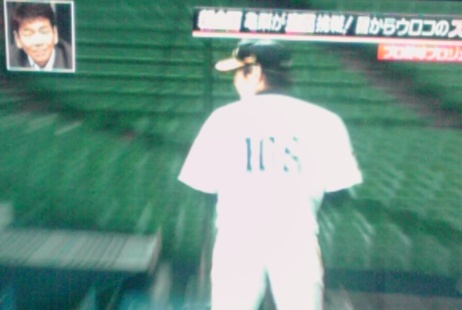 日記を更新するのも、実にひさかたぶりです。このままいくと(いかなくても)自然消滅しそうな勢いでしたが、日記を書こうという気になった、ちょっとした出来事が先週ありました。それは、こちら↓あわてて携帯の写メで撮影したので、思いっきりピンボケしていますが、ホークスの水田さんです。場面は、5月29日夜に放映された日テレの「Going! Sports&News」の番組の一コマ。「亀梨和也が走る!新企画・盗塁挑戦がスタート!パ盗塁王が目からウロコのスゴ技伝授」と題したコーナーで、ホークスの本多選手がコーチ役となり、KAT-TUNの亀梨君が盗塁の極意を学ぶという趣旨の企画でした。何気なーく見ていたら、マウンドに立っているピッチャーの背中が拡大されました。「ん?」「106」「お!」「MIZUTA」おぉー、水田さんではないですか。現役時代よりもちょっと”ふっくら”した感じです(笑)打撃投手に転向後、初めてテレビでその姿を見ました。選手時代と違って、マスコミに登場する機会がめっきり減っていただけに、うれしい一コマでした。交流戦で引き分けをはさんで10連勝と勢いに乗っているホークス。水田さんが裏方を支える一人として頑張っている姿を想像しつつ、夜のスポーツニュースを見るのが楽しい日が続いています。今日のゲームでは、今のところ阪神にちょっと押され気味ですが、終盤に盛り返してほしいですね。