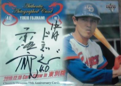 先日、カード交換が成立して到着したのがこちらの1枚です。BBM2010 中日75周年 藤波行雄 刻印直筆(東別院カードショー専用カード)2010年12月に名古屋の東別院で開催されたカードショーで配布された、中日75周年をベースにした、藤波さんの刻印直筆です。カードをご提供いただいたS様、どうもありがとうございました。巨人の元木さんあたりから、BBMではカードショー用に、別仕様で直筆サインカードが作成されるようになりました。”限定品”という点で、コレクター魂をくすぐられる(笑)一枚ですね。ちなみにこのカード、今日、新宿の紀伊國屋書店で行われたカードショーの景品としても配布されていたそうです。