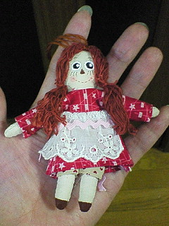 で寝ている隙にこの間から作ってたストラップのカントリードールを完成させました。前に作ったことがあったんだけど、とんとんに牛乳こぼされて顔が変色しちゃったのよね(^o^;