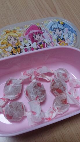 先週?かな?キュアハニーのハニーキャンディの作り方をやってたので、姉さんと作ってみたよ!!・砂糖と水あめを鍋に入れて煮る・はちみつを入れて煮詰める・氷水のボールで鍋を冷やす・クッキングシートの上に広げて、少しずつ手に取って丸める分量は言ってなかったから、適当に・・・。放送を参考にしながら、砂糖1:水あめ1:はちみつ2の割合で作ってみた!!普通にできた!!!ポイントは1、少し煮詰めること。煮詰めないと固まらない。2、丸める時にキレイな仕上がりになる時間が短い 熱すぎると手にべとべと付くけど、冷えるとあっという間に固まってしまう。 きれいな色に仕上がるちょうど良い固さの時間が短いので急ぐべし(笑)子どもでも丸められたので、また一緒にやりたいと思いまーす。