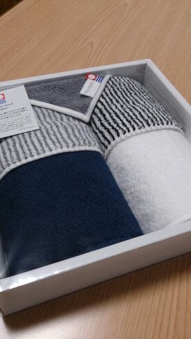 届いたー♪楽天で頼んだパパの今治ハーフタオルハンカチ。 箱から出して広げると。。。 グレー2枚、ネイビー1枚、ブラック1枚、ホワイト1枚。 仕事用だからシンプルなのが良いよね♪ ハンドタオルの半分の大きさで、ふたつ折りにしてポケットに入るという、便利な商品 【送料無料】GOLDPEARL ハーフタオルハンカチ5Pセット [HMT-5PN][TC007-05]【楽ギフ_包装選択】【楽ギフ_のし宛書】【楽ギフ_メッセ入力】 カラフルなのと迷ったんだ~。 今治(いまばり)タオル【Otta(オッタ)】 ハーフタオルハンカチ/二つ折り/クールビス/かさばらない/スーツや制服、バッグのポケットに OT1401-0060-09 25cm×12.5cm 【予約商品●8月中旬(8/12頃から随時出荷)お届け指定不可】 こちらは何かのお返しとかちょっとした贈り物とかにいいかも。 アイロン要らないから、独り暮らししてるパパの弟君にあげたことある♪ 使ってくれてるかなぁ