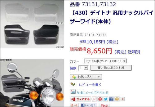 昨日はハンドルに付けるバイザー?で悩んだが、一回り大きなものを見つけた。むむむ、悩みますね~。寒がり屋のオイラはこればっかりは見てくれより効果大を選択なのだ。このデカサはいいねぇ。YSP川崎中央さんのKさんに追加で問い合わせした。そういえばKさんからお見積もりは、バイザー8500円+ステー3000円+工賃5000円+消費税825円=17.325円という回答のメールが来たけど、どっちの見積もりなのか製品名が抜けているのでよくわかんないや。再度どっちの商品の見積もりなのか問い合わせした、やれやれ。