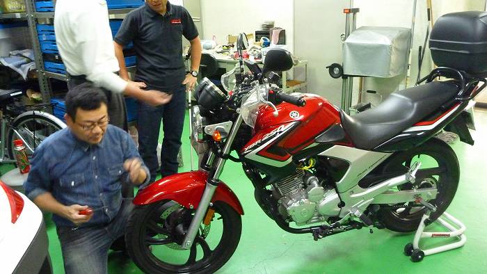 YBR250にシフトポジションインジケーターを取り付けた。なんと無料だ。適合調査協力車両募集中!ということでオイラのYBR250は該当するので本体&取り付け工賃まですべて無料で取り付けて頂けるという。こんなおいしい話はない。これが付けば幻の6速を探すなんてことがなくなる(爆)調子よくバイパスなんぞを走っていてだんだん速度が上がってくるとたま~に今が4速と思い込み5速に入れようと虚しく空シフトアップをやらかすときがあるでもこれが5速だよと教えてくれればそんなドジはしなくなるぞYBR250の6カ月点検する日に合わせてやってもらう段取りをつけておいた。株式会社プロテック■住所:〒216-0006 神奈川県川崎市宮前区宮前平2-5-16■代表電話番号:044-870-5001■ファックス:044-870-9010■サービス課電話番号:044-870-7155電話するとムランティーノさんこと村野様が出てくれる。いよいよ あの計画 を実行する日が来たのだ。9時に会社に行くことにしていた。予定通り到着。すぐに取り付けにかかっていただけた。価格コムに書くのもOK、動画をアップするもOK、顔が出ちゃってもOK、無料で取り付けて貰ったと書くこともOKとOKずくしだ。オイラはデジカメで動画を撮った。残念なことにオイラがチョロチョロしたためにプロテックさんが預かっていたのであろう他のバイクのナンバーまで映り込んでしまってた。なにかトラブルがあってはいけないのでバシバシカットせざるを得ない動画になってしまった。かなり残念だ、まったくトンマなオイラだ次にこういう機会があったらもっとアングルを考えよう。初めからナンバーを隠しといてもらうって手もあったな、残念。2時間半ぐらいで取り付け完了。ミニカウルにヒビが入った原因もわかったし、割れたところは社長が補強して下さったし、錆びるボルトはステンレスに交換していただけたりとありがたいやら感謝するやら、プロテックさんに足を向けて寝られません(^^ゞそして昼は例によってラーメン食べて、13時からはYSP川崎中央さんで6カ月点検だ。約3時間ぐらいかな。6カ月点検+オイル&エレメント交換、チェーンメンテしてもらって15802円だった。オイラは店でバイクみたり、本読んだり、コーヒー飲んだりしていた。すると用務員のおじさん、失礼、会長でしたね(^.^)/~~~ が、1キロほど先にラフ&ロードのショップがありますから見てこられてはどうですか、スクーター使ってください と仰っていただいたので見てきた。このスクーターはマフラーとブレーキが交換してある。マフラーは図太い音で早そう、だけどプラシーボ効果満点だけだったりして(^^ゞ しかしブレーキはすごく良く効いた。普段のゲタがアドレスV125Gなので余計にそう感じたのかもしれない。アドレスV125Gのブレーキは効かないから。ラフ&ロードのショップに行ってみた。おおっ、こんな近くにあったのね、今度きたときは夏物のウエアとか買おうかな。気に入ったよ、このお店。ショップに戻ると点検が終わってた。アイドリングがさがってしまう件はしっかり温めて一番低いところで1350回転だったかな?忘れちまったそれ以下にならないように調整してくれたようだ。タコメーターの回転数なんて結構アバウトなものなのでしっかり機械で計測してもらったので一安心。このバイクは草が多いところに止めてありましたか? と尋ねられた。チェーンとかスプロケに結構付いてたらしい。さすがです。我が家の裏に格納できるようになるまでは石垣の近くでしかも雑草がやたら多くてカバーしてても雑草のなかに置いてあるような状態だったから。これからはコンクリートの上だし草なんてまったくない場所なんでその心配はなくなる。そして17時ごろ帰宅した。プレクサスかけまくって拭き取ってカバーしておしまい。動画をディーガに取り込んで他のバイクのナンバーが映っている部分をカットする作業をしてたら疲れちゃったのでいずれ写真も動画もアップするつもり。今夜はおしまい帰宅したときのメーターは3823キロだ。今日のツーリングは3823-3619=204キロかな。ただいま動画をアップ中。残り568分だって。ADSLはアップが遅いからね。まぁ気長にいこう。出来たかな。