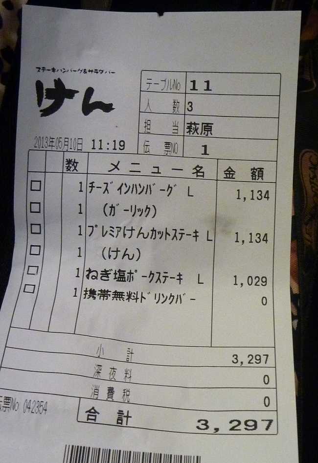 話の種に食べてきた。以前、ステーキガストでひどい目にあっているオイラは懲りないのだ。ガストはひどい肉だった。けんはどうかな?奥さんと次女連れて11時半ごろ到着。客は自分たちだけ。全席禁煙ですけどよろしかったですか?と尋ねられた。よろしかったですか?と言う店員が最近多いけど変な日本語だと思う。ちゃんとした店ならこんな言い方させないんじゃないかしら。まぁ、こんなことが気になるのはジジイだけか。3人で3297円は安いけど。牛はまぁまぁ、豚はイマイチ、ハンバーグはなんか乾いてる??カレーはとっても家庭的な味でおこちゃま向け、コーヒーは不味かった。パイナップルはおいしい、次女なんて何度もおかわりしてた奥さんはコーヒーゼリーが気に入ったみたいでおかわりしてた。オイラはカレー食べて満腹になってしまって二人が取ってきたデザートを摘み食いしてギブアップ。胃袋が小さくなったもんだ。話の種で行ったけどたぶんもう行かないな。オイラは かつ政 がいい。店長が素敵。奥さんたちは とんかつこいで がいいという。意見があいませんなぁ~。