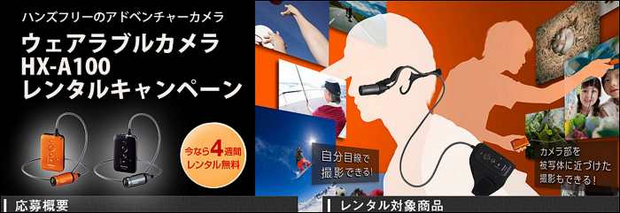 当選するわけないか。それでも応募してみた。外れてもともと。http://panasonic.jp/dmvc/a100/rental/━ 応募完了 ━━━━━━━━━━ ウェアラブルカメラHX-A100レンタルキャンペーン第2回への ご応募ありがとうございました!━━━━━━━━━━━━━━━━━━━━━━━━━━━━■ウェアラブルカメラHX-A100レンタルキャンペーン第2回受付完了 ご応募いただきありがとうございました。 当選された方には、会員情報にご登録のメールアドレス宛に キャンペーン事務局より貸し出しの詳細について連絡させて いただきます。 ◎キャンペーン詳細はこちらから http://panasonic.jp/dmvc/a100/rental/