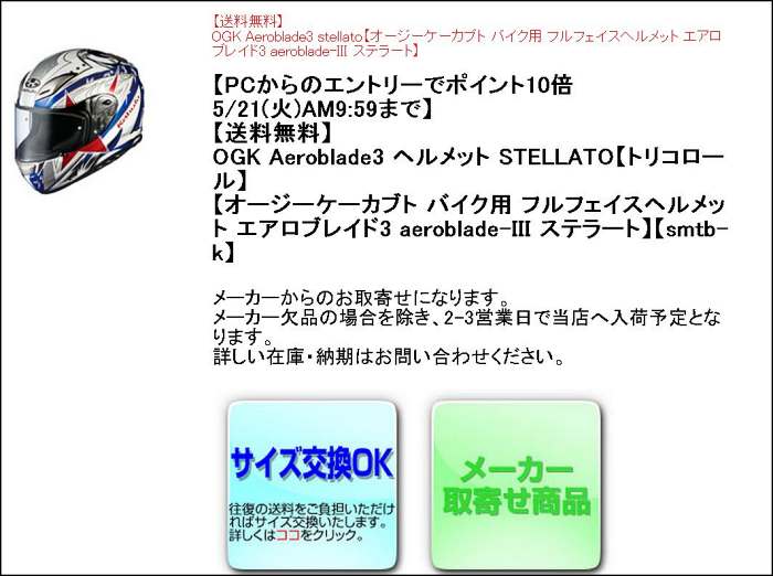 楽天で調べたら安い。しかもポイント10倍だって。さっき帰宅していくらも時間経ってないけど注文してしまった。決断が早いのだあまりにも価格が違いすぎるぜよ~。【送料無料】OGK Aeroblade3 stellato【オージーケーカブト バイク用 フルフェイスヘルメット エアロブレイド3 aeroblade-III ステラート】【PCからのエントリーでポイント10倍 5/21(火)AM9:59まで】【送料無料】OGK Aeroblade3 ヘルメット STELLATO【トリコロール】【オージーケーカブト バイク用 フルフェイスヘルメット エアロブレイド3 aeroblade-III ステラート】【smtb-k】[商品]【PCからのエントリーでポイント10倍 5/21(火)AM9:59まで】DAYTONA #65430 ソリッドエンブレム 「M」【デイトナ】(09-)価格 250(円) x 2(個) = 500(円) (税込、送料別)獲得ポイント5----------【PCからのエントリーでポイント10倍 5/21(火)AM9:59まで】【送料無料】OGK Aeroblade3 ヘルメット STELLATO【トリコロール】【オージーケーカブト バイク用 フルフェイスヘルメット エアロブレイド3 aeroblade-III ステラート】【smtb-k】(01-)サイズ:Mカラー:トリコロール価格 23,200(円) x 1(個) = 23,200(円) (税込、送料込)獲得ポイント232***************************************************小計 23,700(円)消費税 0(円)送料 0(円) 離島・一部地域では別途料金が必要な場合がありますポイント利用 -1,798(円)---------------------------------------------------合計 21,902(円)---------------------------------------------------今回のお買い物で獲得するポイント 237---------------------------------------------------*消費税について 消費税率 5% 消費税計算順序 1商品毎に消費税計算 1円未満消費税端数 切り捨て---------------------------------------------------*送料等の諸費用は変わる場合があります。*ポイント利用方法で「全て」を選択している場合は、購入後の金額変更や利用可能ポイント数の変更により、利用ポイント数が増減する場合があります。*楽天会員を利用したご注文の場合、キャンペーン特典ポイントが本メール記載の獲得ポイントとは別に計算、付与される場合があります。ご不明な点がありましたらショップ「オートバイ用品店ライドスタイル」までお問い合わせください。