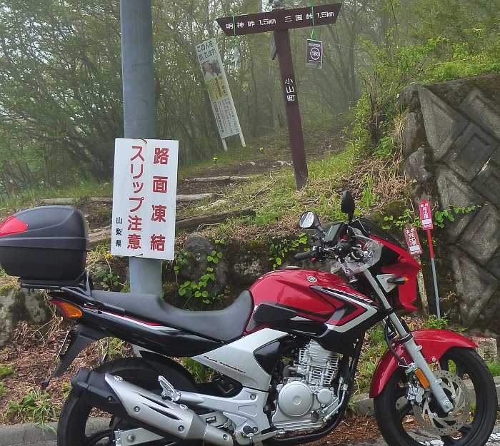 奥さんは静岡でダンスの何かがあるとかで早く出かけてしまった。ということでオイラはツーリングに行くことにした。今日は暖かいというか暑いらしい。なおさらオイラにぴったりだ。温泉博士で山梨に行こうと思ったけどこの本で入れるものにいいところがない。ならば自腹でいい温泉に行こうと決めた。行先は韮崎旭温泉だ。アワアワであの山口温泉よりもアワアワだと自分では思っているいい温泉だ。今日もツーリングはなるべくダブらないように道を選んでいこう。山梨に入ったら広域農道をなるべく多く走るつもり。こうすれば道はスイスイだ。山中湖に着いたらガンガン晴れてきた。いつもの安いスタンドでガソリン補給だ。あとで計算したら52.17Km/Lだって。さすがに少ししか入れてないからあてにならないや。こんなのは入れ方でどうにでもなっちまう。だぶん40Km/Lぐらいだと思う。最近は4000回転でシフトアップの省エネ運転だから。上り坂以外はめったに5000回転まで回さない。高速は別だけど河口湖ではラーメン食べて甲府盆地をめざす。途中から広域農道で行く。案の定、道はガラガラで走りやすい。甲府へ正直に向ったらはまってたところだ。まったくスイスイだ。そして到着~。600円になってた。ここは4度目かな。山口温泉よりもアワアワでお気に入りだ。みるみる体に泡が付く。泡をとってもすぐに泡が付く。いいねぇ~。温泉には25分ぐらい入ってたかな。たった25分のために来たのだ。大満足。そして外のテラスで富士山見ながらぼ~っとしてた。のぼせた体を冷ましてから帰宅した。途中ループされてる道でパチリ。帰りも広域農道でスイスイ。河口湖に出て有料道路と東名使って帰宅した。17時には帰宅できた。早く出かけて暗くなる前に帰宅するのがオイラの基本だ。帰宅時のメーターは3483キロだ。前回が3163キロだから320キロのツーリングだった。暖かかったから持病でないかもねそれにしてもアイドリングがだんだん低くなってきた。帰宅したときはとうとう1200回転をやや下回っている。YSP川崎中央さんにはメールで伝えてあるから調整してくれると思うけど。アイドリングの上げ過ぎは嫌よ~いつものようにプレクサスをあっちこっちに吹きかけてささっと拭いておしまいにしようとしたら。ん? ん? あらら~!!!!なんじゃこりゃ~。ミニカウルの左側の部分にヒビが入ってるなんでさ、倒してない、押してない、力も加えてない。誰かがギュッと押した?なんでかな~。原因がわからん。右側と比べると左側はボルトが通ってる穴もずれている。いつからかしら?前回拭いた時はヒビ割れは気が付かなかったなぁ、だから今回か?まったくわからん。ああだこうだと言ってもなっちまってるものは何とかせねば。ということで瞬間接着剤を裏から塗りこんでおいた。薄いビニールの使い捨て手袋があったので人差し指に接着剤を付けてその指をヒビ割れているカウルの裏側からヒビに擦り込むようにしてみた。こんなんで付くかなぁ?なんかいい方法はないかしら?