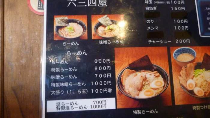 2日連続のラーメンだ。体に良くないなぁわかっちゃいてもやめられない。YBR250の1年点検の帰りに ラーメン六三四屋 本店 に寄った。前回は特製ラーメン900円を食べたので今日は何にしようかな~とメニューを見てた。おっ、特製塩ラーメン1000円てのもあるんだ。塩でやるとはたいした自信だ(笑)ということで注文した。おおっ、おいしいじゃないの。うん、満足、チャーシューがトロンとしてて旨いねぇ。☆5つ決定~(^^♪後半、ちょっと塩がきつく感じたけど客層がブルーカラーが多いから塩分はこれくらいでいいのかな。
