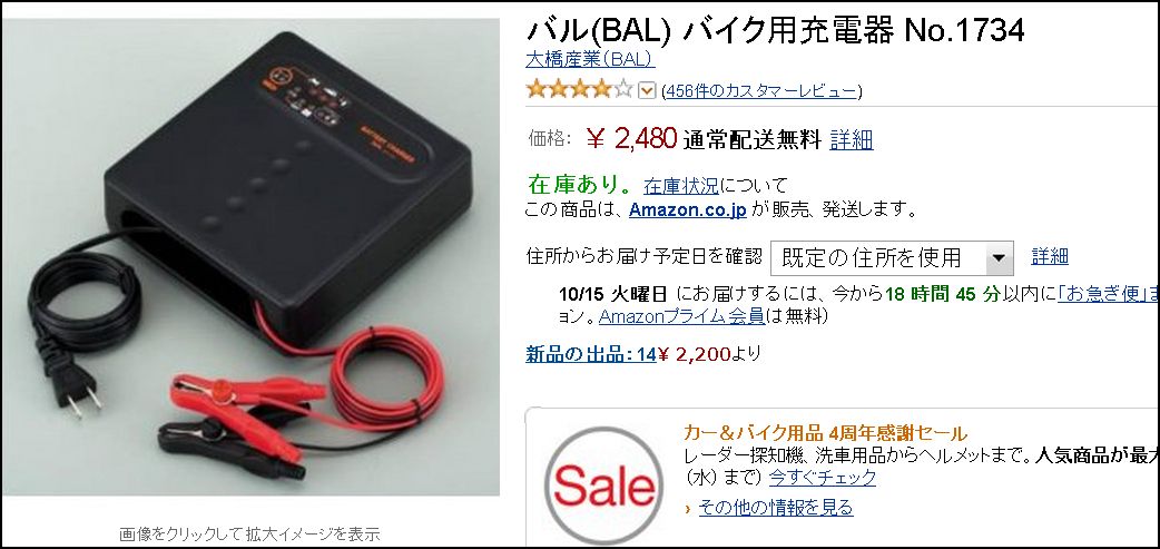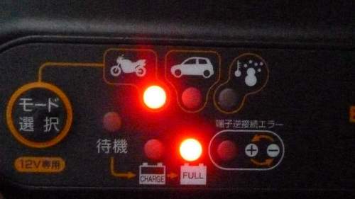 10/13に車のバッテリーを上げてしまったので(室内灯の消し忘れだ(^^ゞ)充電器で無事に充電できたが、その際にモード切替のスイッチがバカになりつつあって何度も押さないと切り替えられない症状になってた。たぶん20回以上押してようやく切り替わったと思う。そこでこれに見切りをつけて評判の良さそうなのを注文した。10/16に届いたバイク用バッテリー充電器 BC-GM12-V(12V用)【自動電圧調整】をようやくYBR250に使うことが出来た。届いたときに、とりあえず予備バッテリーを充電してみたらちゃんと充電出来てたようだ。翌日にはトリクル充電を示す緑のランプが点滅してた。ちょっと仕事を早めに切り上げていよいよYBR250に充電だ。高山ツーリングして3日経過している。1年点検の時もYSP川崎中央さんのバッテリー診断だと新品時と比較して75%ぐらいと判定されている。1年経てばそれくらいヘタるということだ。まずは取説に従い赤いコードをプラスに接続して次にマイナスを接続する。すると赤と緑のLEDが点灯して正常に接続されていることになる。そしていよいよコンセントに繋いで充電開始だ。開始だ・・・・しないのかいな?へっ?念のため、接続確認・・・OKでも充電中に点灯するLEDが点かない。一旦外して再び同じ手順でやるもダメ。念のために充電器とコネクターも外して付け直しするも充電にならない。わぉ、もう故障かしら。まぁこういうこともあるさ。こういうのって中に温度ヒューズが付いてるのかな?そういうのが切れちゃってたりして。いろいろ想像してもしょうがない。試しにYBR250のセルはちゃんと回ってエンジンは一発でかかる。ショップにメールしておこう。ショップはここだ。必要十分な機能をコンパクトにまとめた充電器★送料無料★ 【シンプル操作】【生活防水】 (CBR400R 対応) バイク用バッテリー充電器 BC-GM12-V(12V用) 【数量限定】冬の間つけっぱなしOK!【自動電圧調整】とりあえず商品レビューにも追記しておこう。1個目の予備バッテリーは充電できたのですが本日2回目で充電中にならなくなりました。詳しくは下記に書きました。保障願います。http://plaza.rakuten.co.jp/mmatsutaro/diary/201310210000/とメールしておいた。夕飯食べ終わって再チャレンジ・・・やっぱり充電しない。今まで使ってた充電器はバッテリー上げてしまった車にトリクル充電中だったけど外してはYBR250に接続。相変わらずモード切替がなかなか切り替えられなくて(たぶん30回はプッシュした)どうにかバイクのモードに出来て充電を始めた。車でちょっと出かける用事が出来たのでセルを回すと・・・・元気よくセルが回った。次の車検時にはバッテリー交換だな。暫くしてからメールチェックしたらもうショップから返信メールだ。お世話になります。バッテリーストア.comと申します。当店をご利用いただき、ありがとうございます。この度は弊社よりお送りさせていただいた製品が動作不良を起こしたとの事で、大変ご迷惑をお掛けしたことを深くお詫び申し上げます。誠に申し訳ございませんでした。本日、検品済みの充電器を改めて発送させていただきました。新品がお手元に届きましたら現在お手元にございます不良充電器を、ドライバーさんが回収する手配を行っておりますので、そのままお渡しくださいませ。なお、商品の到着予定は翌々日となっております。伝票番号は下記の通りでございますので、併せてご確認頂けましたら幸いでございます。おおっ、すごいレスポンスだ。そしてもう発送手続きに入ってるらしい。いいねぇ、車のバッテリーもここで購入しようかな。忘れないようにしておこう。