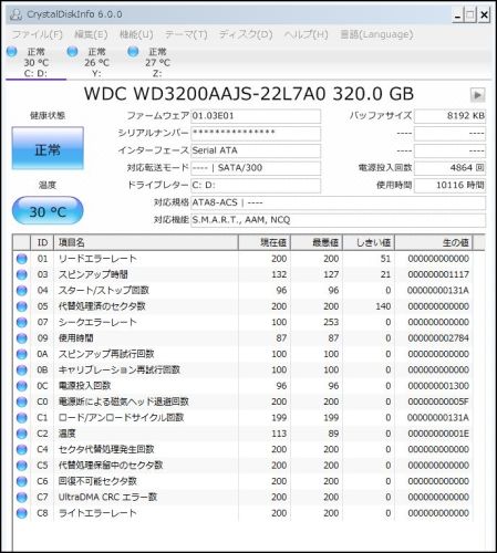 HDDの健康具合がわかるらしい(笑)CrystalDiskInfoが6.0になったのでさっそくバージョンアップした。正直、オイラには数値を見てもいいのか悪いのかわからないまぁ、これが警告したらヤバイぞってことかな。今稼働しているHDDは3個だ。ひとつは電源オフ中。室温21度で2時間使用している状態だ。調子はいいのかな?
