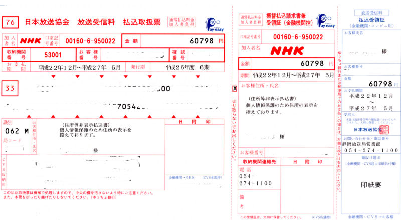 NHKの契約は義父がしていた。しかし義父の具合が悪くなり口座引き落としの残高は少な目にしていた。しかし、そのままだと万一残高不足で引き落とせなくなると困るので支払の口座はオイラのに変更することになった。義父はとある病気で身体障碍者手帳を交付となりNHKの受信料は割引されていた。その後他界して今に至ってた。NHKの受信料はずっとオイラから引かれ続けてた。何の手続きもしていなかったらNHKから差額分の支払いを求める文書と払込伝票が届いた。身障者割引が適用されなくなった差額を支払うようとのことだ。その金額は 60798円 だ。差額の期間は平成22年12月~平成27年5月って書いてある。ん?今は平成27年2月なのにどうして5月まで?1年ずつ一括払いしているから清算の都合で5月なのかしら?それにしても デ、デカイなぁ、6万て。でもまぁ払いますか、いい番組作ってくれてるし。国営放送がまだ必要なのかなって思いはあるけど。特に今の会長ってどうなの?って思いはありますけど・・・・。今日コンビニに行って払って来よう。