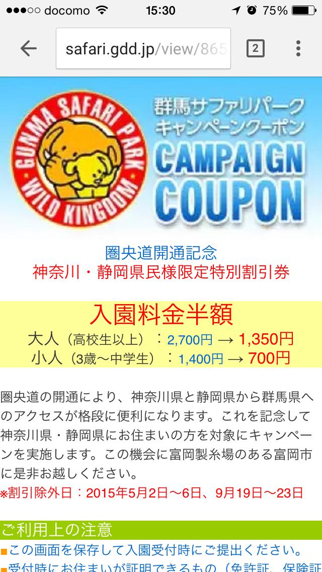 ネットをウロウロしてたらサファリパークが半額になるというので保存した。年内有効らしい。iPhone5Sに保存したのでこれを見せればいいみたい。静岡に住んでて良かったかな。