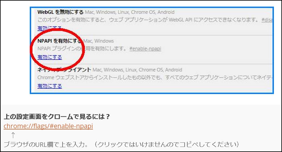 ネットをウロウロしてたら4/17Google ChromeでSilverlightが起動しない不具合というのを見つけた。ほほ~、参考になります~。chrome://flags/#enable-npapi ↑ブラウザのURL欄で上を入力。(クリックではいけませんのでコピペしてください)中段くらいに「NPAPI を有効にする」の項目がありますので、これを有効にしてください。ここの項目がデフォルトで「無効」になっていることが原因です。最後に、一番下の「今すぐ再起動する」を押すことで、ブラウザ再起動をしてください。これで、再生できるようになります。設定して再起動・・・・・。やってみようっと。やってみた。おお~、ルートラボが復活~。これでいいや。