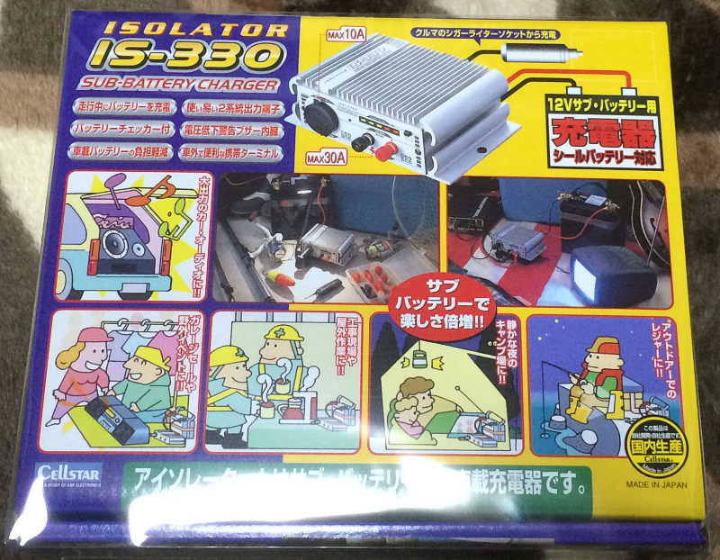 車中泊したときにテレビ見たりするのに便利な車載充電器を買ってみた。クーポン配付中!走行中に常時サブバッテリーを充電。【送料込】セルスターサブバッテリー用車載充電器IS-330このショップが安かった。使い道はいろいろだ。サブバッテリーは前の車の交換したバッテリー。廃棄せずに家に残ってたものだ。こんなのでも12Vで作動する電気ひざ掛けが一晩使えた。これなら寒い時期の車中泊でも電気行火がわりに使える。テレビもOK。ヘタって逝っても廃棄予定だったバッテリーなのでどおってことないし。走ってる時にこれでヘタったバッテリーを回復させて次の夜にはまた使えるようになる。今思いついたのだがこれと死にかけてるバッテリーの組み合わせでドラレコ、ケンウッドKNA-DR300の駐車モードの延命に使えるかな。案外、一晩使えたりして。いつか実験してみよう。