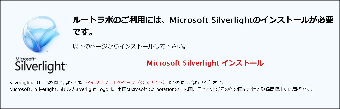以前も使えなくなったときがあったっけ。今回もいつものようにルートラボを使おうとしたらこんな画面が出た。なになに?古いMicrosoft Silverlightをアンインストールしてからインストールしろってか。はいはいやったろうじゃないの。ちゃんと使えるんでしょうねぇ。やってみた。しかしインストールしたのにさっきと同じ画面だ。ふ~ん、それじゃあ再起動してみよう。でも変わらず。じゃあ例のSilverlight プラグインを有効ってのをやればいいのね。しかしプラグインにないないんじゃあやりようがないよ~。どうしたもんだか。クロームでダメならIEでやってみるか・・・・出来た。てことはクロームがダメってことか。ダメじゃんクローム。苦労無(くろうむ)なんてダジャレを言ってる場合じゃない苦労してますよん。早くなんとかしてくだされ~。