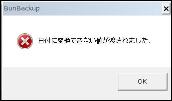 BunBackupでずっとバックアップしている。ミラーリングが出来て差分だけ?なのでとっても早く済む。たしか最初だけ全部バックアップするけど次回から差分だけにしてあるからとっても早い。もう何年使っているかな、とっても便利なソフトだ。今日も帰宅してエクセルを動かした。18時半に自動でバックアップする設定にしてある。いつものようにソフトが起動してささ~っと終わると思ったらエラーの音がしてこんな表示が出た。日付に変換できない値が渡されましたなんじゃこりゃ?わからん。FAQがあったので見たけどわからないや。日付か、なんか狂ったのかしら。一旦全部アンインストールしてタイトルってのから作り直したほうがいいのかな?オイラのバージョンは3.42だった。最新のは4.1みたい。ずいぶん古いのを使ってたものださてさてどうしよう。問い合わせ出来そうだからメール送ってみようかしら。案外最新版にしてタイトルから作り直したほうがいいと言われたりして。まぁそれでもいいや、バックアップはしておかないと不安だ。