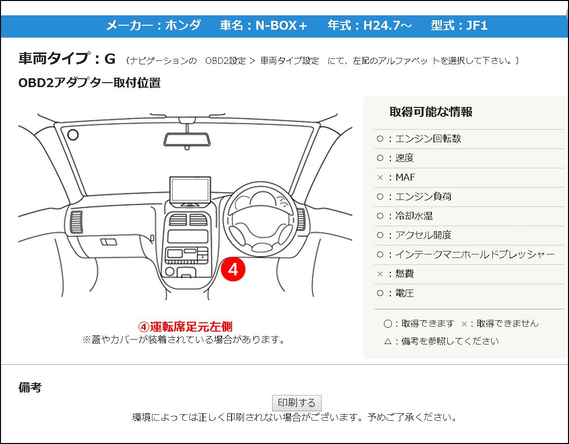 同じパナのゴリラなので今までの台座がそのまま使えたのはラッキー(^^♪VICSと地デジアンテナは先日購入したエレワークスさんのものをセット。適当に配線をして映りを確認したらバッチリ。NBOX+カスタムに付いてるものとゴリラで2CH体制だ。なんてアホなことはしないけどねVICSもほどなく受信してバッチリ。残念なのは今までゴリラに使ってたリモコンは使えなくなった。というかリモコンにそもそも対応していない。こんなところにもコストダウンの影響があった。古いゴリラはバイクに使うのでそもそもリモコンは使ってられないし、事実上のジエンドだな。あとはOBD2アダプターをセットすればいいんだけど暗くなったんでおしまい。そのうちやってみようと思う。パナのHPに接続の位置とかが載ってた。設定は「G」らしい。ん?OBD2接続適合表対象モデル: CN-GP757VD、CN-GP755VD、CN-GP750D、CN-GP747VD、CN-GP745VD、CN-GP740D※CN-GP747D/GP745D/GP740D で OBD2アダプターを接続して使用するには、ナビ本体のバージョンアップが必要です。バージョンアップ後はナビゲーションを出荷状態に戻す必要があり、本機で設定した内容や登録した情報(登録地点など)、My ストッカー内のファイルが初期化されます。オイラのは755なのでそのまま使えるようだ、またまたラッキー夕飯食べてからセットした。これってブルートゥースで接続なのかな?簡単だった。配線は適当に(^^♪セットして完了。エンジン回転数とか水温とか見られるけど正直見ないな。それよりもナビとしての精度が良くなってくれればOKだ。あとは走ってみないとわからないな。どうしようかな?