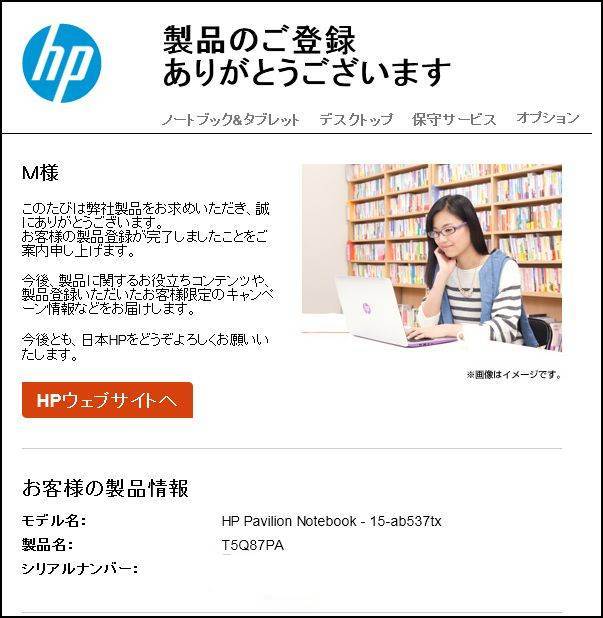 オイラが買ったのはPavilion 15-ab200 第6世代パフォーマンスモデルなんだけど製品登録しようとして、そうだプログラムのアップデートがあるのかなぁと見ていくと、1/17付けでいろいろなアップデートがあった。1/20に納品したものもやっぱりやっておくんだろうなぁとは思ったが型番が違う。HP Pavilion Notebook - 15-ab537txqだって。違うというかHP的には同じ扱いなのかな?まっ、アップデートは掲示板見てからでもいいかとやめておいた。するとアンケート画面が出てきたので自分の製品の型番がないのでまた出直しま~す(笑)みたいな回答をしておいた。そしたらメールが届いた。やっぱ違うていうか製品登録した感じはしなかったけど、したことになったのかしら?マイッカ。
