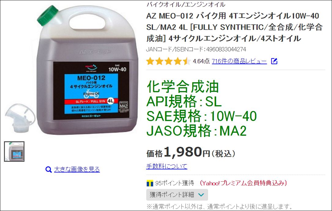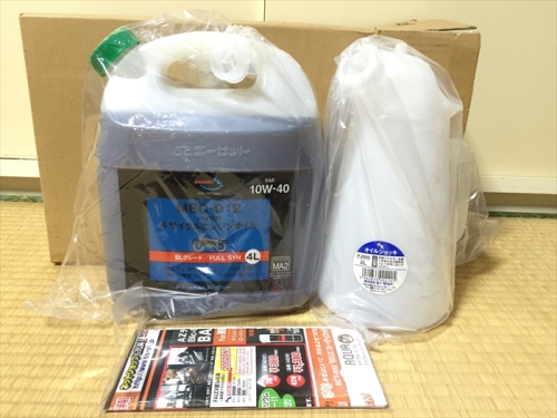 知り合いが安いけどいいというし、レビューもほぼ良いので注文してみた。AZ MEO-012 バイク用 4Tエンジンオイル10W-40 SL/MA2 4L [FULLY SYNTHETIC/全合成/化学合成油] 4サイクルエンジンオイル/4ストオイルたしかにレビューはほぼ良いものだらけ。オイルの表記はマジェスティSと適合しているけど果たしてどうかな?4Lで税込み・送料込みで1980円、しかもレビュー書くと蓋無しだけどオイルジョッキがオマケとして貰えるんだと。当然レビュー書くさもっともオイラは蓋付きの2Lのジョッキを買ってしまったけど。友人のS氏に差し上げようかしら?もっとも彼は自分でやらないかな。彼もお金で解決派だろうから6000キロになったらこれにしてみよう。大丈夫かなぁ・・・・。