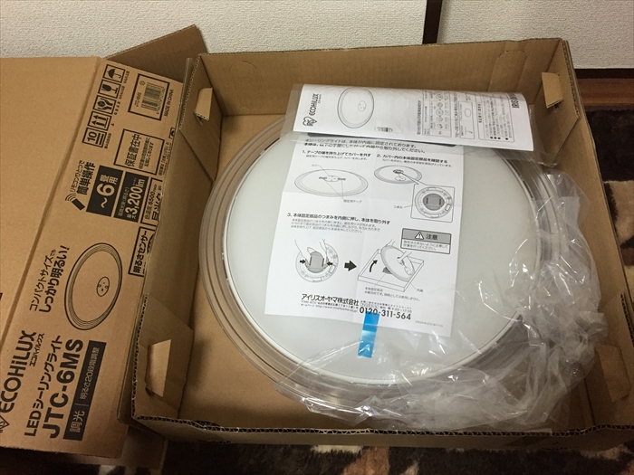 安かったのでLEDにした。LEDシーリングライト 照明 6畳 調光 3200lm JTC-6MS 調光20段階+LED常夜灯 アウトレット アイリスオーヤマ[個 数]1(個)[単 価]4980(円)(税込)[金 額]4980(円)(税込)送料込みだから安かった。これで1室以外はようやくLEDになった。少しは省エネかな?