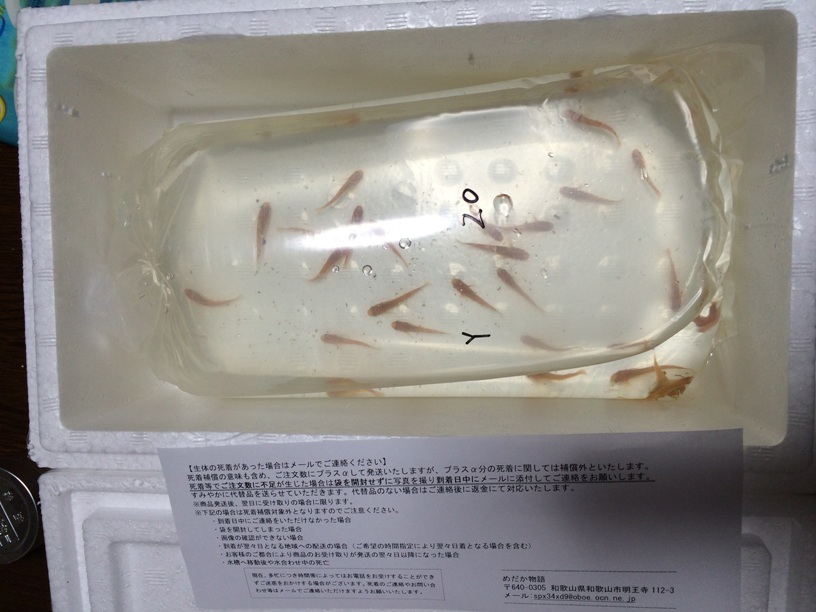 今日から4日間働こうかしら。しかし今日は早く帰宅したい。メダカがくる日だ。さっさと帰ろうとしたら仕事がワンサカ。なんでかなぁ。なんとか17時半に帰宅した。すぐに夕飯だ。最近の我が家の夕飯は17時15分と早くなってきた。なのでオイラもさっさと帰宅するようにしている。15分遅れたけど奥さんは待っててくれた。そして18時15分ごろメダカ到着。みんな生きてる何匹いるか後で数えてみようと写真撮っておく。24匹ぐらいいるのかしら。まずは90センチ水槽に袋ごと着けておく。水温を合わせるためだ。30分待ってからメダカを容器に静かに移し水を排水させて最小限の水とともに静かに水槽に入れた。見た感じ元気に泳いでいる。落ち着くのに時間がかかるだろう。徐々に暗くなってきているとこのまま今日は寝てもらう。長旅の疲れもあるし。食事は明日からだ。楽しみだねぇ。