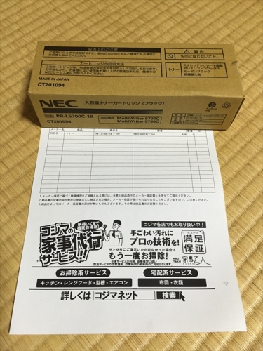 5月15日に注文したものが届いた。荷物を受け取った時にあまりにも軽いので中身がないのかと思ったほど軽かった。しかし、ちゃんと入ってた、当たり前か。うれしいことに不要となったトナーは無料で回収してくれるらしい。引き取ってトナー詰めてリサイクルなのかな?なんでもいいや、省資源になるならそれでいいと思う。