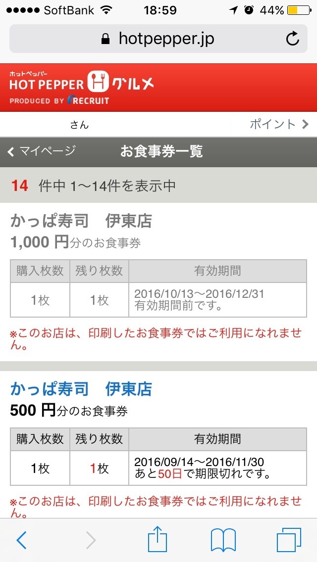 以前、ポイントが溜まってたので500円分を伊東のかっぱ寿司に換えておいた。かっぱなら株主優待も使えるし。すると今夜も1000ポイント貰えた。いつも「ホットペッパーグルメ」をご利用いただき、ありがとうございます。この度は、「ホットペッパーグルメ」の会員様の中から抽選で、ホットペッパーお食事券で使える【ホットペッパーグルメ限定ポイント】を特別にプレゼントさせていただきました。今回の加算ポイント【ホットペッパーグルメ限定ポイント】1000ポイント今回の加算ポイントの有効期限2016年10月31日までなんだかわからないけど貰えるものは貰っとく小市民。これもさっそく食事券に換えといた。これで1500円分食べられる近いうちに食べてしまおう。