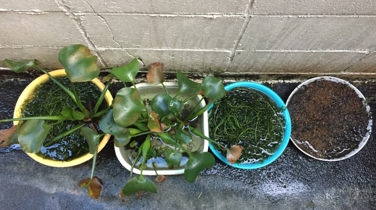 メダカ好きのH氏がアナカリスを買ってこようかなというので我が家のものを好きなだけ持って行かせた。親メダカの水槽はジャングルのようになってしまってる。好き放題繁殖させていたらいつの間にやらアナカリスのジャングル状態だ。引っこ抜くと赤玉土に根が付いているのでそれが抜けてしまうのはイヤなのでハサミで途中から切っていく。赤玉土もいっぱい渡す。これに差し込んでおけばすぐに根付いてどんどとん増えまっせ~。ジャングル状態のおかげで親メダカの水槽でも稚魚が生まれている。隠れ場所があるから親に食べられずにいたらしい。稚魚は年越しできるかな?