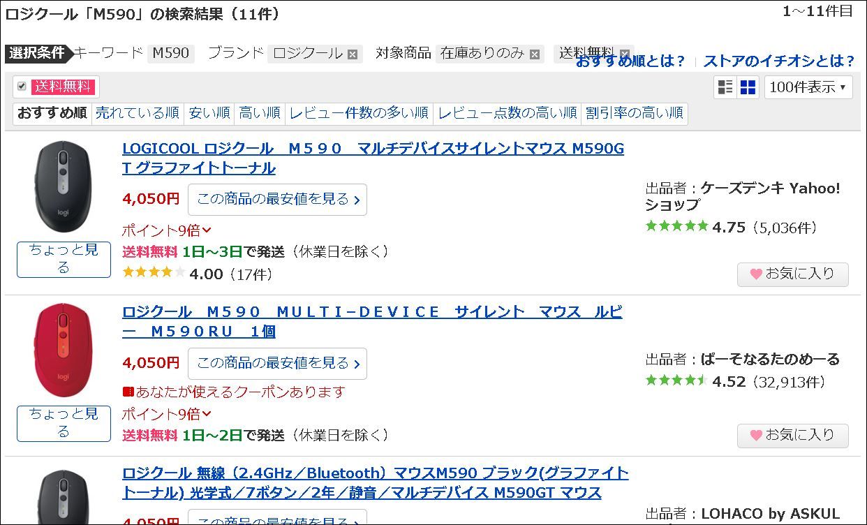 永く使っていたロジクールのマウスが最近になって右クリックが無反応になってしまった。右クリックが逝ってるとやたらと不便だ。そろそろ買い替えだな。またロジクールでいいや。M590にした。どこが安いかな?ヤフーだと高い。価格コムだと安い。ということで久しぶりのノジマにした。久しぶりにログインしたら100円分ポイントが有った(^^♪2865円が100円お得。ご利用ポイント:100pt獲得予定ポイント:0pt (出荷の翌日に付与)お支払い合計金額:2,765円