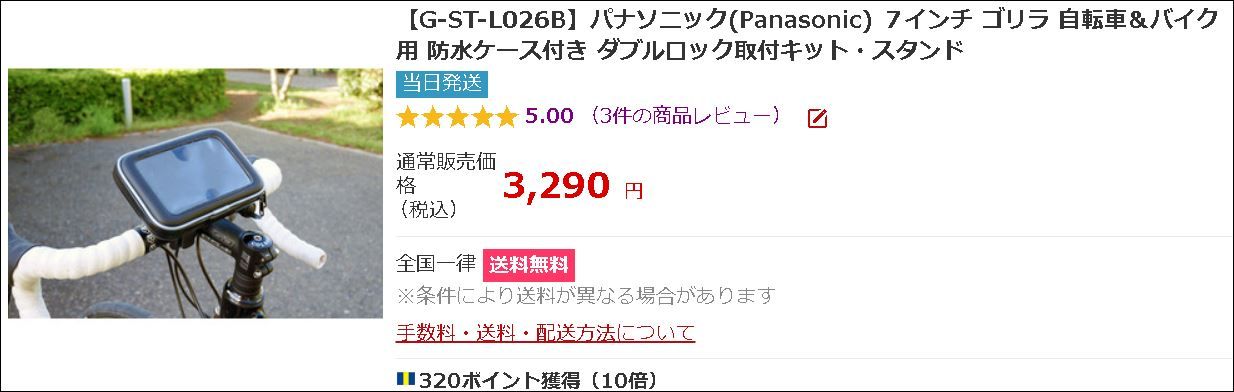 先日は基台がぐらついてたのをバッチリ固定することが出来た。購入したものは7インチ ゴリラ 自転車&バイク用 防水ケース付き ダブルロック取付キット・スタンドというものだがこれは防水ケースの中に入れるので音は聞こえないはナビは熱を持って充電池に良くないわ、ということで雨のとき専用で使うことにした。てことは雨じゃない用のものが欲しい(^^♪で、注文した。ゴリラ&ミニゴリラ 自転車&バイク ハンドル ダブルロック取付キット・スタンド CA-PT20D CA-PTQ22D 代用品これを普段使いとしよう。同じエレワークスのもので取り付け部分は同じ構造。グルーガンで食いつきを良くしたのでバッチリ固定できるはずだ。マジェスティSにいつも積んでいる雨対策用のサランラップとセロテープはようやく不要となる・・・・はずだ。【G-ST-116B】パナソニック(Panasonic) ゴリラ&ミニゴリラ 自転車&バイク ハンドル ダブルロック取付キット・スタンド CA-PT20D CA-PTQ22D 代用品G-ST-116B-022,040円×1=2,040円発送目安:13時までの注文で当日発送(休業日を除く)商品の合計金額 : 2,040円送料:0円ポイント利用分:417ポイント合計金額 :1,623円通常ポイント:20ポイント期間固定Tポイント Yahoo! JAPANカード会員特典:20ポイント Yahoo!プレミアム会員限定!ポイント5倍!:80ポイント 【22:59まで】ハッピー2アワー ポイント5倍:80ポイント合計獲得予定ポイント:200ポイント