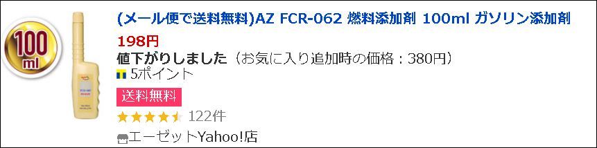 モーターサイクルショーで試供品で貰ったPEAは評判が良さそうなので使ってみようと思ってた。調べたら380円が198円になってた。一人5個まで。5個買っても1000円しない。買ってしまえ。マジェスティSは約7.4Lらしいので15CCでいいかな。NBOX+カスタムは約60CC入れればいいか。安全の為に少なめに入れてみようと思う。