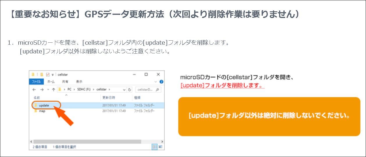 以前、更新年月日がおかしな日付になってた。問い合わせしたところセルスターの手違いからそうなったようで送ってくれれば直しますということだったがそれでもデータはちゃんと更新されてますということだったのでほっといた。どうやら今回はそれを訂正させるべくupdateフォルダを削除してから更新するようアナウンスされていた。これで更新日付が訂正されるんだろうな。今回のみ削除してくださいというんだからそうなんだろう。指示どおりやって更新した。確認しないけどマイッカだな。
