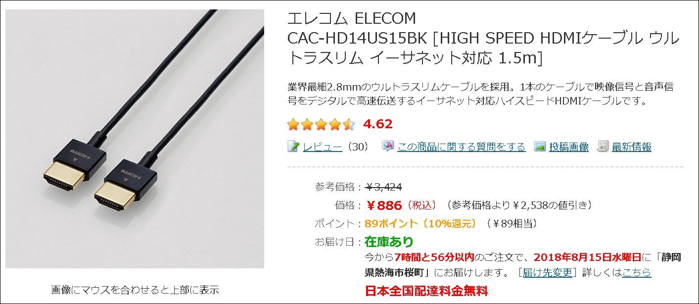ヨドバシさんから届いた。エレコム ELECOMCAC-HD14US15BK [HIGH SPEED HDMIケーブル ウルトラスリム イーサネット対応 1.5m]配達希望日:2018年08月14日合計 1 点 890 円配達料金: 0 円・ゴールドポイントでのお支払い 292 円・クレジットカードでのお支払い 598 円・今回の還元ゴールドポイント数 60 ポイントこれをNBOX+カスタムに使おうかなと。ブルーレイプレーヤーがほしいな。