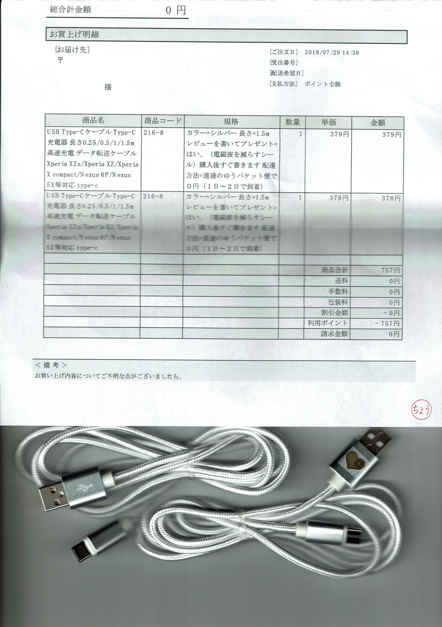 先日は50センチを購入したがもうちょっと長いのもあったほうがいいので1.5メートルを2本買った。動作確認したらちゃんと充電も転送も使えた。(1)USB Type-Cケーブル Type-C 充電器 長さ0.25/0.5/1/1.5m 高速充電 データ転送ケーブル Xperia XZs/Xperia XZ/Xperia X compact/Nexus 6P/Nexus 5X等対応 type-c216/216-8カラー:シルバー長さ:1.5mレビューを書いてプレゼント:はい、(電磁波を減らすシール)購入後すぐ書きます配達方法:速達のゆうパケット便で0円(1日~2日で到着)379円×1=379円発送目安:12時までの注文で当日発送(2)USB Type-Cケーブル Type-C 充電器 長さ0.25/0.5/1/1.5m 高速充電 データ転送ケーブル Xperia XZs/Xperia XZ/Xperia X compact/Nexus 6P/Nexus 5X等対応 type-c216/216-8カラー:シルバー長さ:1.5mレビューを書いてプレゼント:はい、(電磁波を減らすシール)購入後すぐ書きます配達方法:速達のゆうパケット便で0円(1日~2日で到着)378円×1=378円発送目安:12時までの注文で当日発送商品の合計金額 : 757円送料:0円ポイント利用分:757ポイント合計金額 :0円通常ポイント:6ポイント期間固定Tポイント Yahoo!プレミアム会員限定!ポイント5倍!:24ポイント Yahoo!プレミアム会員限定 掲載ストア対象ポイントキャンペーン:30ポイント合計獲得予定ポイント:60ポイントクーポン利用:あり(上記合計額は39円値引き済みです)