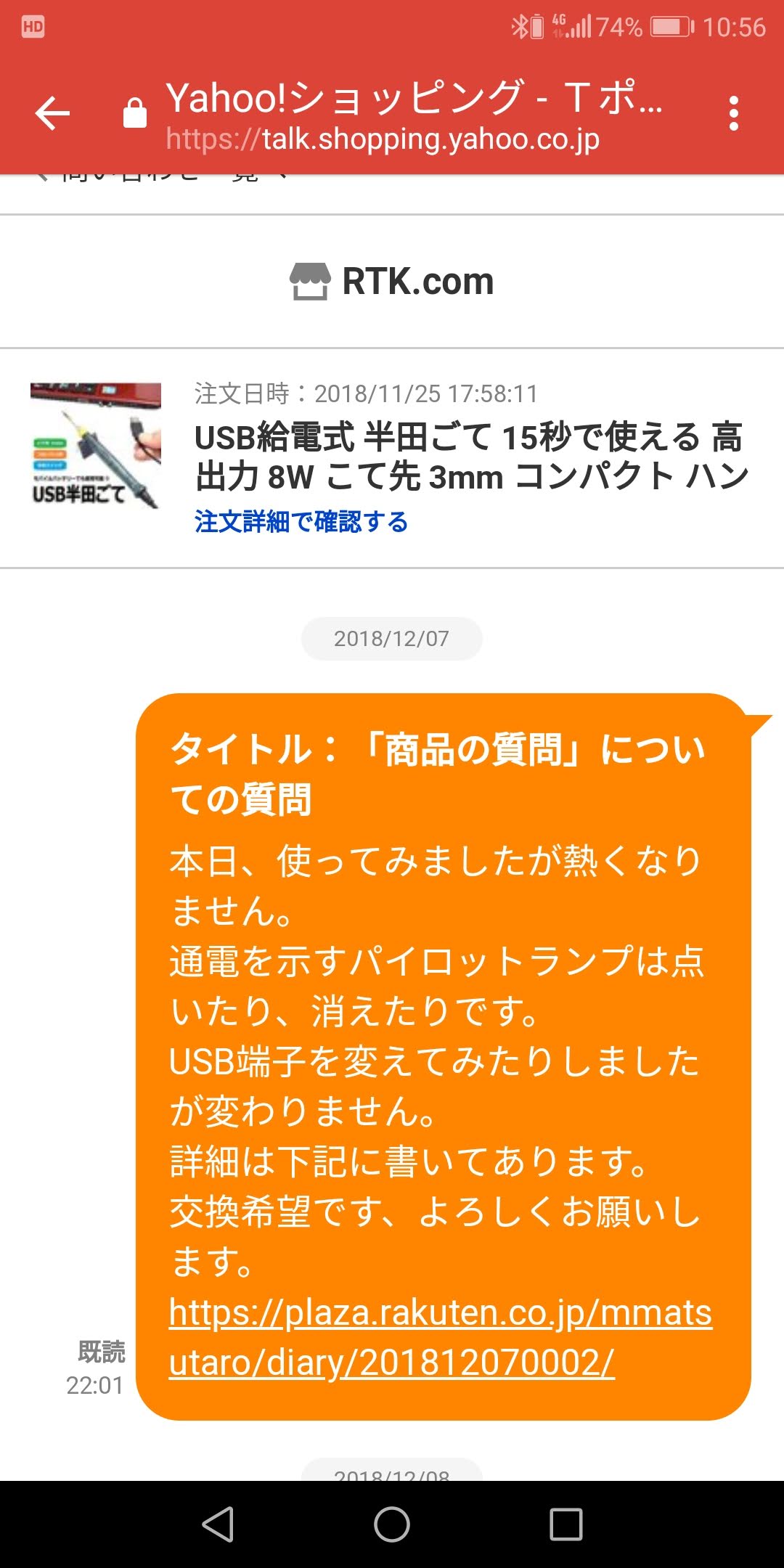 外出時はドラレコはサブバッテリーで常時録画させている。ただ帰宅して切り忘れが怖いのでパイロットランプが欲しかった。探してたらちょうどいいのがあったのでお試しで2個買ってみた。まずは点灯確認・・・・OKだ。さっそく先日購入した半田ごてでコードを延長するぞ。半田ごては初めて使う、動作確認兼ねてだ。しかし、ん?熱くならないぞ。パイロットランプが通電を示すが切れてしまう。通電???また点く。が切れる・・・・点く・・・・切れる。触っても全然熱くない。おやおや、いろいろ弄ってみるが熱くならないどうしたもんだか。PCのUSB端子は3.0のところに刺してある。念のためモバイルバッテリーでやってみる。出力は2.1Aだ。満充電してある。・・・・が熱くならない。おいおい、アンラッキーかよ。堪忍してくれ~。ショップに連絡してみよう。本日、使ってみましたが熱くなりません。通電を示すパイロットランプは点いたり、消えたりです。USB端子を変えてみたりしましたが変わりません。詳細は下記に書いてあります。交換希望です、よろしくお願いします。https://plaza.rakuten.co.jp/mmatsutaro/diary/201812070002/届いたようだ。いつもYahoo!ショッピングをご利用いただきまして、誠にありがとうございます。Yahoo!ショッピングストア「RTK.com」に送信されました。ストアから連絡があるまでお待ちください。ご自身の質問と回答一覧に関しては、以下のURLからもご確認いただけます。【問い合わせ内容】https://talk.shopping.yahoo.co.jp/detail/c84773dd0f9af918b6ec74f9bfb991e081e4719757d5a72c8++++++++++【質問の種類】注文後【注文ID】rtk0727+++++【対象商品】https://store.shopping.yahoo.co.jp/rtk0727/17-1212-c092.html 【質問カテゴリ】商品の質問【タイトル】「商品の質問」についての質問【本文】-----------------本日、使ってみましたが熱くなりません。 通電を示すパイロットランプは点いたり、消えたりです。 USB端子を変えてみたりしましたが変わりません。 詳細は下記に書いてあります。 交換希望です、よろしくお願いします。 https://plaza.rakuten.co.jp/mmatsutaro/diary/201812070002/ -----------------【連絡先】++++++@+++++【公開設定】非公開ご注文後、電話やメールで複数回連絡を行ったにも関らず、ストアと連絡がとれない場合や、注文した商品が届かない場合は、下記のヘルプページも参考に、ストアへの連絡をお試しください。ストア(店舗)と連絡を取りたいhttps://www.yahoo-help.jp/app/answers/detail/a_id/40107/p/599**********************************************このメールはシステムによりYahoo! JAPANから自動送信されているため、このメールに返信することはできません。**********************************************今後ともYahoo!ショッピングをよろしくお願いいたします。Copyright (C) 2018 Yahoo Japan Corporation. All Rights Reserved.それにしても最近、ハズレが多い、悪夢だ~。