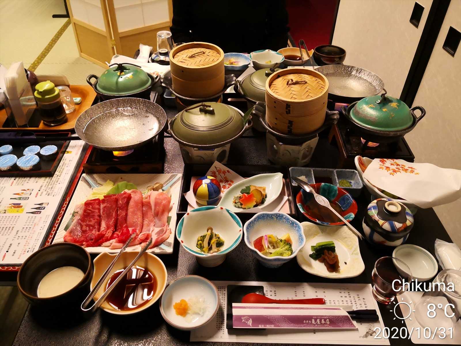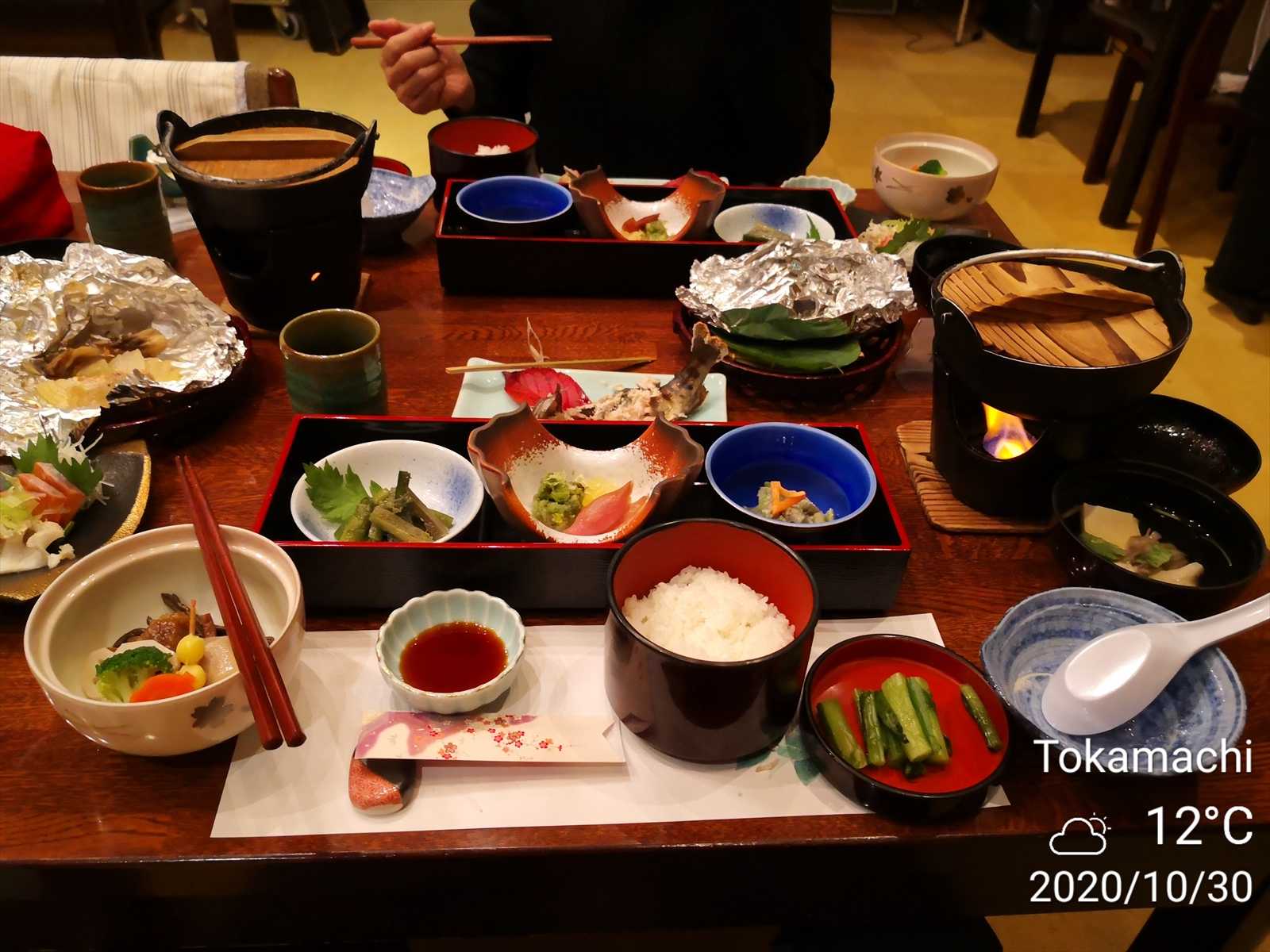 オイラは大きな勘違いをしてしまってた奥只見湖から山田温泉 亀屋本店は遠かったナビで計算したら距離優先だと到着時間は22時だ予約は18時だ全然ダメじゃんならばと高速優先で計算したらぐるっと日本海側に出て到着予定時間が21時10分だ宿に電話してみる食事は21時までです、その時間だと食事はありませんとだよね~、何とかしちゃいますといつもは90キロのクルコン走行だが久しぶりにブイブイ走るぞそして余裕で?宿に到着して夕食にありつけたなんだか食べ応えがあるぞ満腹だ~器を片付けて空いたスペースにまだ追加で出てくるさすがに多いわ、食べきれん奥さんはモリモリ食べるよく食べるね~食べられないよりはいいか