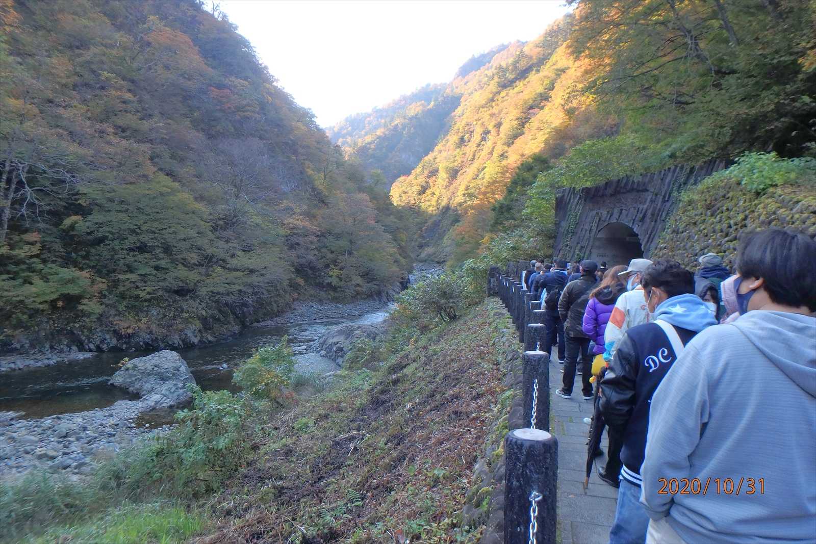 清津峡は初めて3時ごから駐車場に停めて待機する観光客もいて8時半には宿の前まで行列ができるんだとさすがの人気スポットだ清津館は清津峡の入り口にあるので車は止められるし一番近い宿なので見に行くには最高のロケーションだ8時45分ごろ、もう待てなくなって行ってみたまだ行列が残ってた水がはってある水面に反射して丸く見える演出だ靴がしみてしまうからと裸足で見ていく人もいるこれしかないからそうしたけど足が痛いくらい冷たい~とだよねぇこの景色が見たくてここに来た宿も清津館にして良かったよここから出発するときには駐車場待ちの行列が出来てたいつになったらPに入れられるのかな?今日は土曜日だからまだまだ車は来るぞ