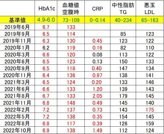 先日の旅行で食べまくりで体重は1.9kg増えて帰宅したHgA1cはちょっと増えて血糖値はかなり上がってるかなと想像して検査を受けただいたい予想した通りだったまぁこんなもんだな鋸山で疲労困憊でまだ膝、腰、腿がいたいからCRPの数値も悪くなってるけどこれも想定内だな
