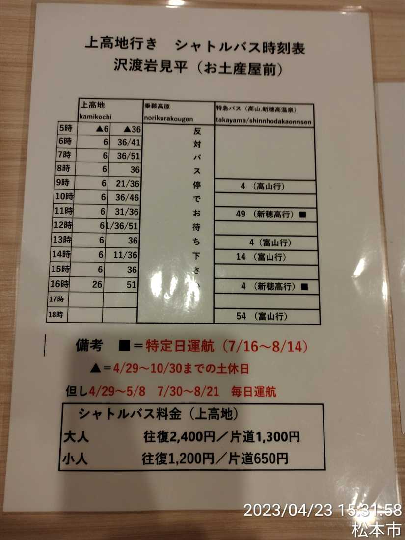 今日はいよいよ上高地食事は7時15分バスは30分間隔、徒歩1分でバス停なのでとても便利6分と36分にバスがある臨時が出るときもあるらしいがゴールデンウイーク前で空いてるらしいいいタイミングできたと思う連休に入ったらすごい人が上高地の雰囲気は味わえなかったと思った往復割引で切符は2600円が2400円で済む朝食は7時15分バスは8時6分に乗った先客は4人、バス停からは6人で10人で上高地に向かった30分もかからずに到着したかな晴天ではないが気持ちいい2日間とも雨とは無縁なのが奥さんの晴れ女パワーかな毎回晴れ女パワーで助かっている河童橋でパチリいつもは大正池から歩いてここがゴールだったけど今回は初めて明神池まで往復する5回目にして初めてだ約1時間で明神池に到着入口でひとり500円二人で1000円支払うがここの人はちょっとおかしな日本語を話す奥さんが細かいのを使い切ってしまったので1万円札をだすと おつりは要りますか? とのたもうたはぁ?なんだそれ?日本語としておかしくないかいあったりまえだろ!!胸ぐらつかんでやろうかと思ったそんな思いをしたが景色は最高だったもっと写真があるけど面倒(^^;帰りの道中も景気を堪能したしお猿さんも道の真ん中に居座って臆病な人が立ち止まってたけどオイラは無視して猿のすぐ脇を歩いて抜けていくあの人はいつからビビッて立ち止まってたんだろう振り返るとビビッて立ち止まったままだ目を合わさなきゃ平気なのにビビる人ほど目を合わせてしまうんだろう奥さんもビビったがあっちの方を見て歩けば大丈夫だよと言い聞かせてなんとか抜けられた河童橋まで戻って歩き疲れたので甘いのを2つ買って奥さんとシェアした帰りのバスは満席に近かったタイミングよく13時15分出発宿からはNBOXで岐路だ高速メインで帰宅できた2023年04月24日 13:51 - 19:43、255.85 Km 5 時間 50 分、2ハイタッチ、コレクション1個を獲得、バッジ56個を獲得、テリトリーポイント550pt.を獲得