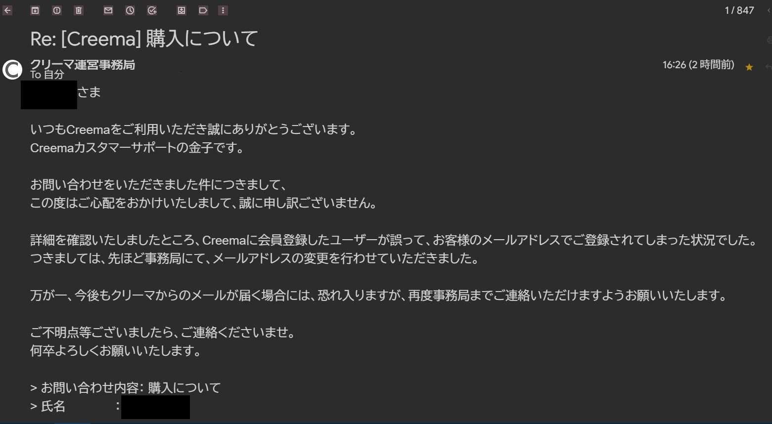 はぁ?注文というか存在すら知らなかったショップ Creema から購入やらログインやらのメールがきたまったく身に覚えがないのでメールしておく詐欺じゃね?そしたらようやく返信がきたどうやらお客が間違えてこっちのアドレスを打ち込んだらしいそれにしてもおかしいななんでログイン認証とか出来ちゃうの?なんやそれ?まぁ解決したからいいけどさ万一メールが届くようなら連絡くださいってかいいよ、もう迷惑メール扱いにしといたからさぁ